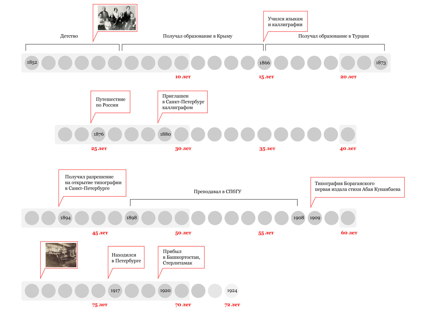 В 1880 году Ильяс Бораганский получил приглашение работать каллиграфом в Министерстве иностранных дел, но отказался и через два года осел в Санкт-Петербурге.